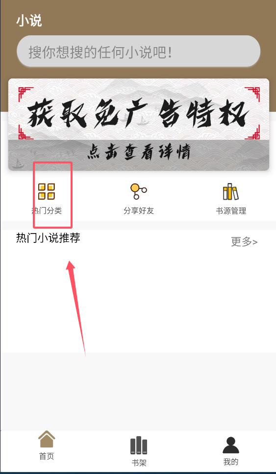 1、首页布局很直观,顶部搜索框配合中部功能入口,新手可以从热门分类入手找书,想精准找书就用搜索,分享按钮能随时推荐精彩章节。