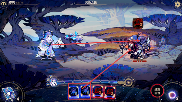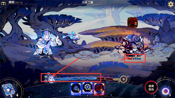 2、在【污染之礁】场景中,操控【穆妮-恒星门链】角色,使用带【3】伤害的卡牌,攻击当前血量【7/7】的敌方单位。