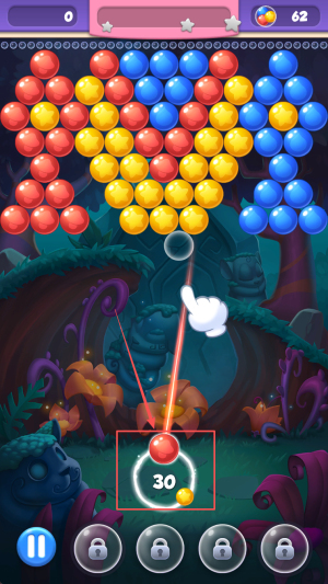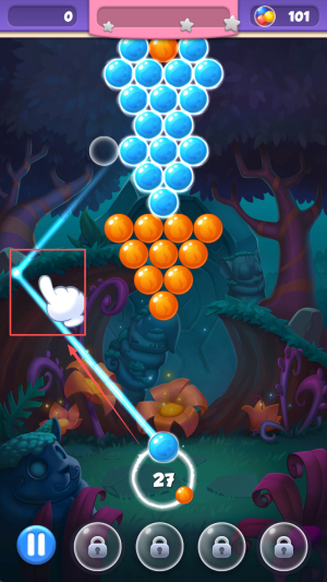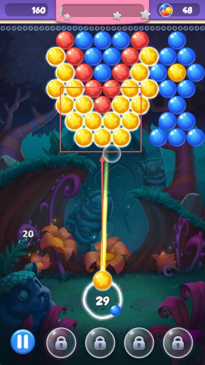 2、瞄准发射消除:观察泡泡颜色分布,瞄准同色泡泡发射,确保至少 3 个同色相连完成消除,累积分数进度。