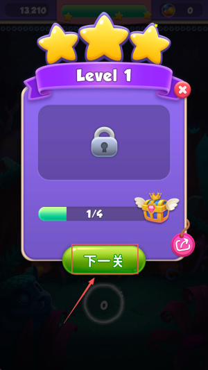 4、完成目标:在13.210 Level1 1/4界面完成当前目标,点击“下一关”继续挑战。