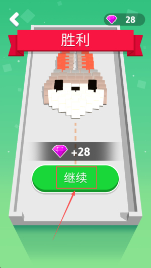 4、完成通关:出现“28 胜利 +28”后点击“继续”,进入下一关。