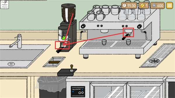 1、先操作【磨豆机】完成咖啡豆研磨,关注界面显示的【11:30】时间,按红色标注步骤触发对应设备功能。
