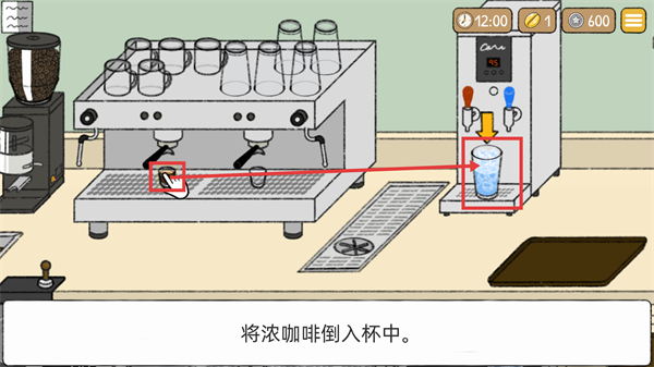 3、完成咖啡萃取后,依照提示【将浓咖啡倒入杯中】,此时界面显示的【12:00】时间同步更新状态。