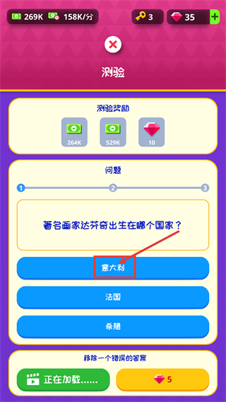 2、面对“达芬奇出生国家”的问题,选择【意大利】选项,也可移除错误答案辅助答题,推进测验流程。