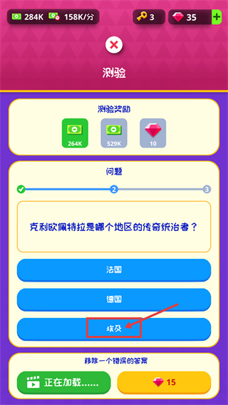 3、第二题关于克利欧佩特拉的地区,选择【埃及】选项,持续正确回答可提升测验奖励层级。