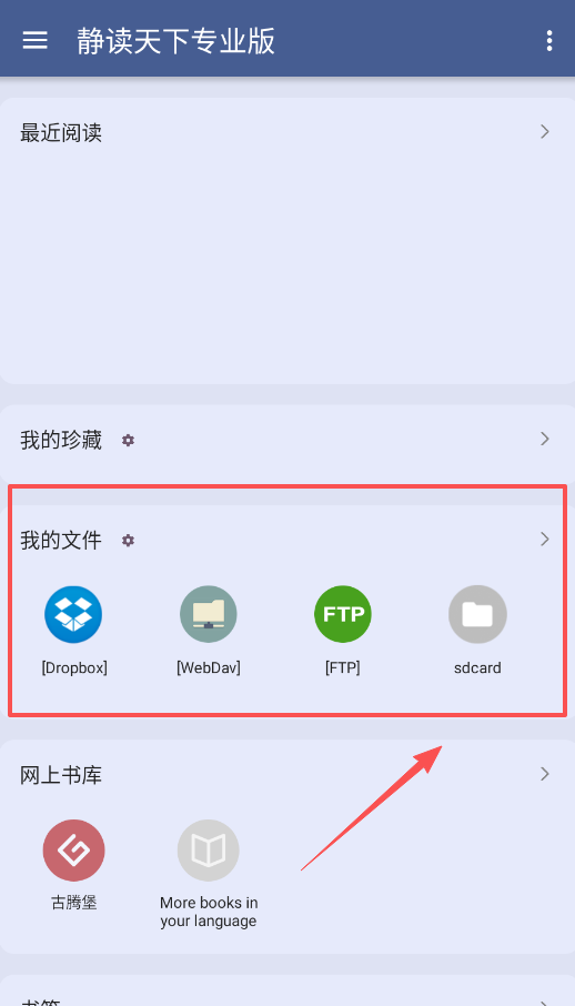 1、首先呢,在主界面你可以轻松访问最近阅读和我的珍藏,网上书店板块还提供了古腾堡等更多语言书籍资源。