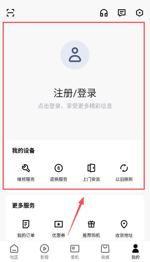 1、先在“我的”页面完成账号登录,之后就可以管理你的设备,查询订单,并享用推荐购机、以旧换新等多种会员服务了。