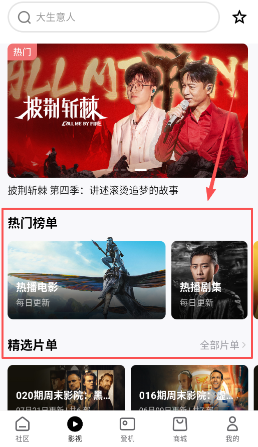 2、想看片就点“影视”,这个页面汇聚了热门内容和官方推荐片单,像“披荆斩棘”这类综艺和周末影院专题,都能在这里直接找到并播放。