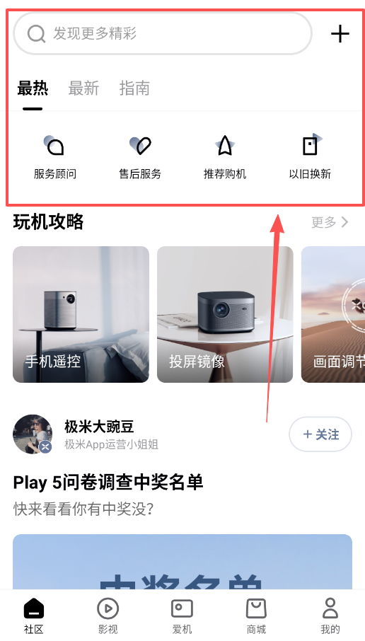 3、想学技巧或参加活动请去“社区”,这里提供了从手机遥控到画面调节的多种攻略,还能查看最新公告,比如Play系列的中奖名单。