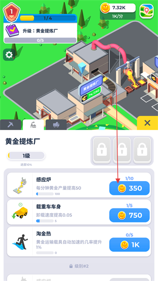 3、打开提炼厂升级界面,点击感应炉对应的按钮花费350金币升级。