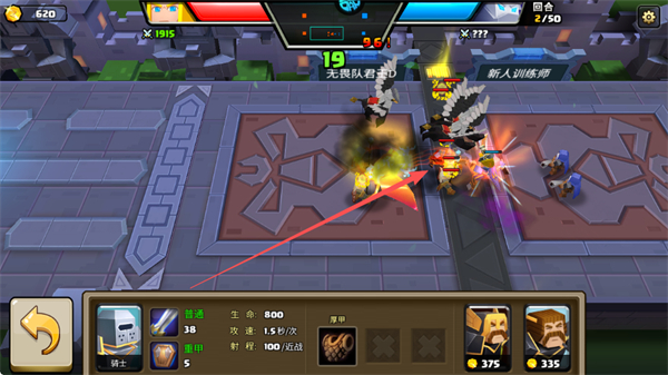 1、操控己方单位如骑士与敌方无畏队君王交战,利用攻击技能消耗敌方血量。