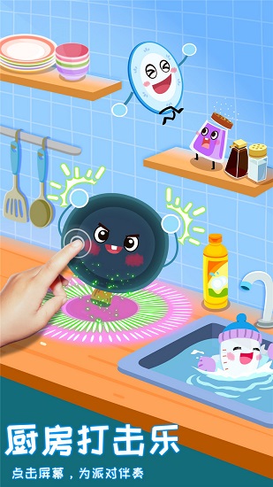 敲!厨房的铁锅和奶瓶动起来了,敲击锅盖和瓶子,叮叮咚咚~敲好听!