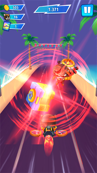 4、触发加速特效,追击前方角色,同时收集道具,分数升至1371。