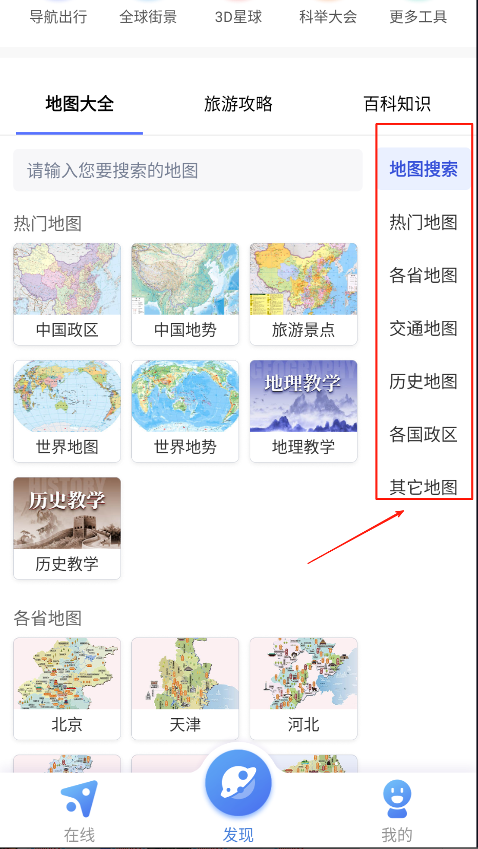 1、打开在本站下载的中国地图app,在发现功能板块中用户可以查询到各省地图、历史地图、各国政区等等地图。