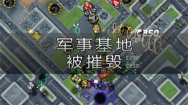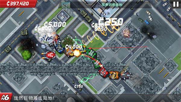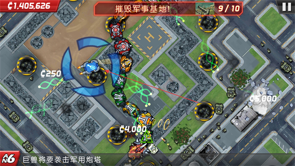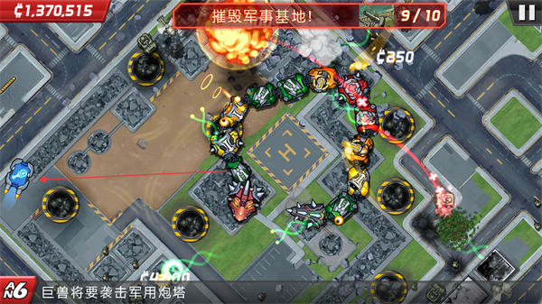 1、操控巨物沿路线移动,攻击军事基地的建筑、炮塔等目标,获取金币奖励。