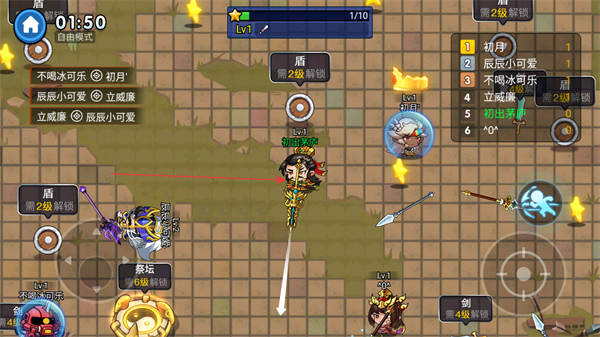 2、击败敌方玩家后提升等级,继续收集武器、攻击目标,积累积分。