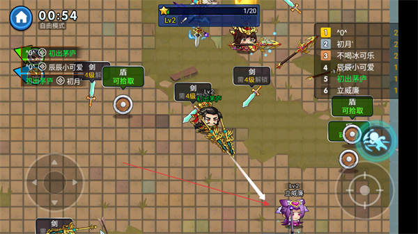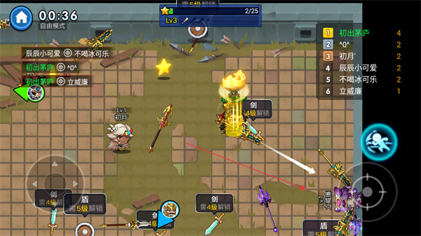 1、操控角色移动,拾取场地中的武器如剑、盾提升战力,同时攻击其他玩家。