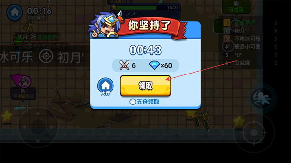 4、战斗结束后,点击“领取”获取坚持奖励如武器、钻石,完成本轮游戏。