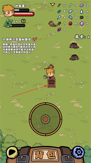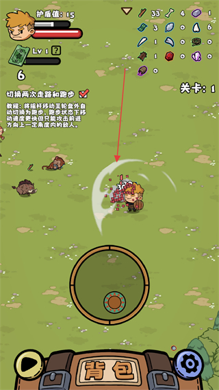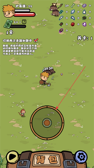 2、进入关卡1,按提示切换武器和跑步,躲避怪物攻击。