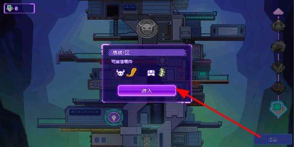 1、场景中找到对应区域的进入按钮,点击进入该区域,可查看该区域的可掉落零件,推进游戏流程。