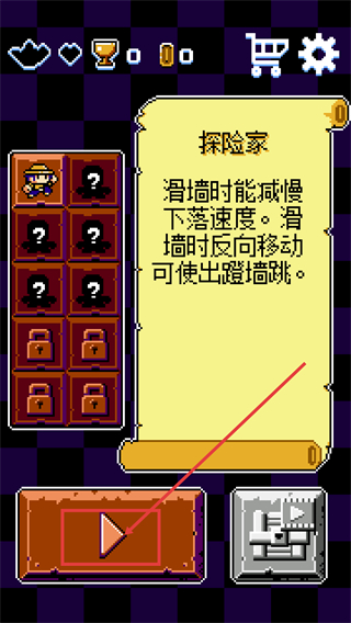 1、选择【探险家】职业,该职业滑墙时能减慢下落速度,滑墙反向移动可使出蹬墙跳,点击被标注的按钮进入对应探索玩法。