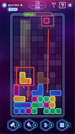 4、方块填满一行就会消除啦,连消多行还能得【特殊音爆块】哦,奖励超丰厚,快试试多连消吧。