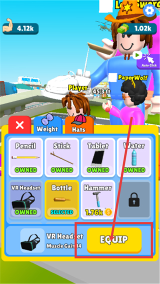 4、点击背包里的【VR-Headset】道具,点击【EQUIP】按钮装备它,能切换道具啦。