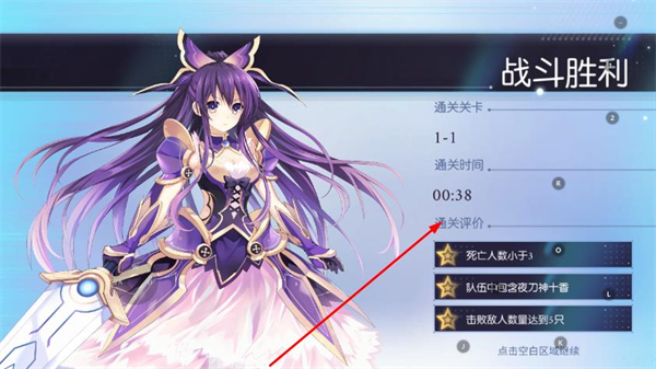 4、通关后会显示战斗胜利界面,可查看通关时间、关卡评价等信息,点击空白区域即可继续后续内容。