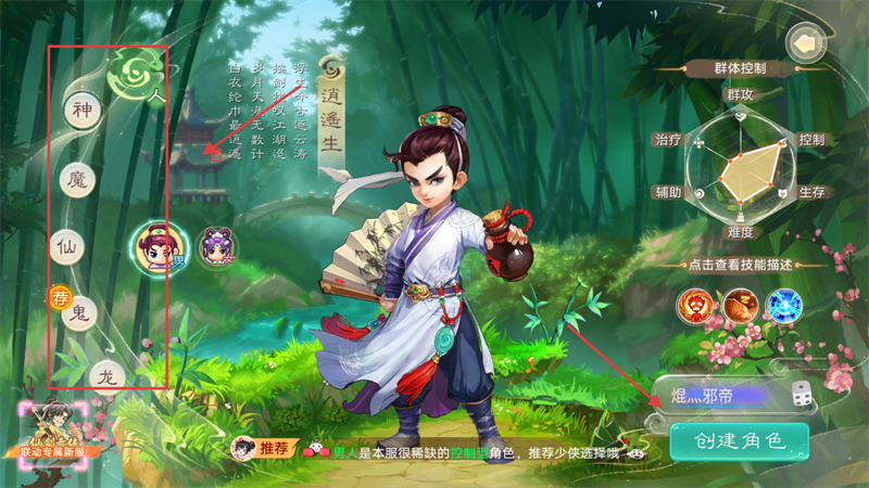 2、选择种族(如人、神、魔等)、性别,输入角色名后点击【创建角色】,完成角色创建。