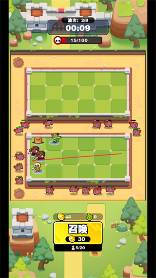 3、继续点击召唤消耗30金币补充单位,让单位自动攻击敌方,积累关卡进度。