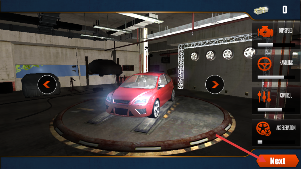 2、在车库界面选择车辆后,点击右下角橙色【Next】按钮,进入驾驶场景。