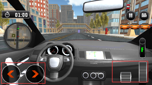 3、游戏中通过左侧方向键控制转向,右侧踏板控制前进、刹车,在城市道路开始驾驶。