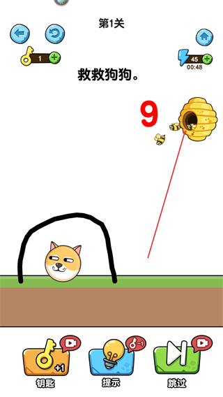 狗狗触碰危险或被蜜蜂蛰咬时,会出现搞笑的反应动画,让失败也变得充满乐趣,不会让玩家产生挫败感,反而更想尝试新的画线策略。