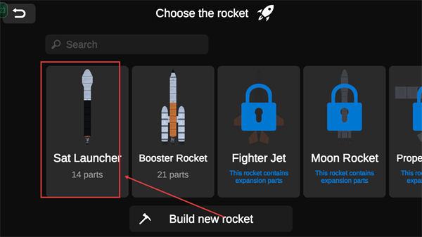 2、进入选择火箭界面,可选择已解锁的【SatLauncher】,或点击【Buildnewrocket】开始设计新火箭。