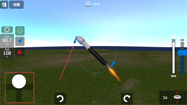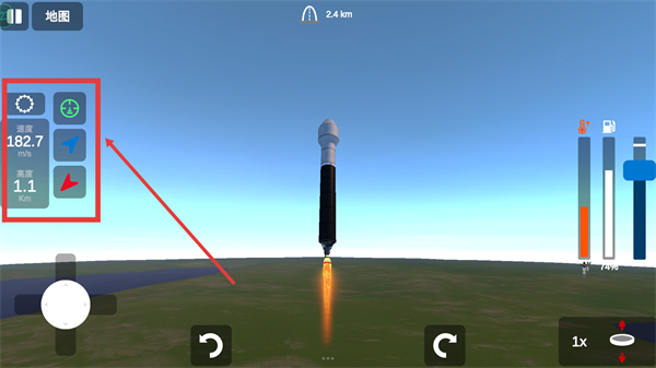 3、火箭发射后,通过左侧控制按钮调整飞行方向,同时关注【速度】【高度】数据确保飞行稳定。