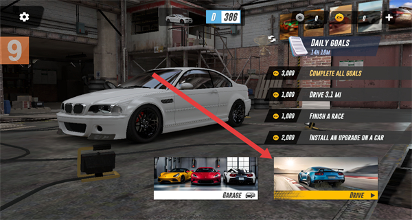 1、在游戏主界面,可以通过点击DRIVE按钮,进入赛道驾驶场景。