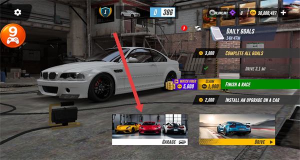 1、在游戏主界面,点击GARAGE按钮,进入车库的车辆管理界面。