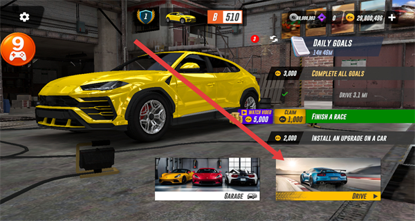 3、完成车辆更换后,返回游戏主界面,点击主界面的DRIVE按钮准备进入驾驶场景。