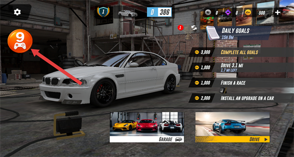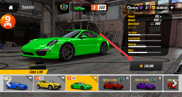 4、在获取到金币后返回游戏主界面,可以点击按钮消耗金币,在车库中购买更换新的车辆。