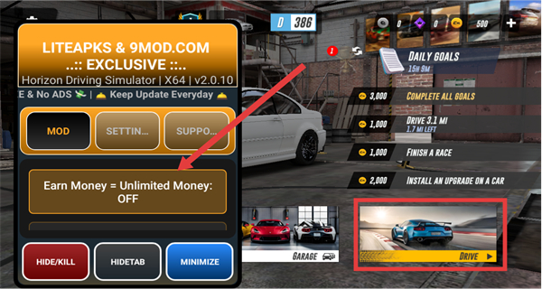 2、在弹出的功能菜单中,找到Earn Money=Unlimited Money选项,开启无限金币模式。