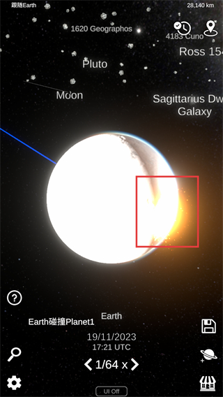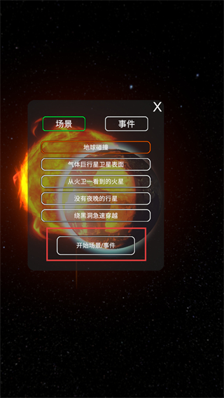 1、在【场景】界面选择如【地球碰撞】的事件,点击开始,触发对应天体模拟场景。