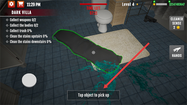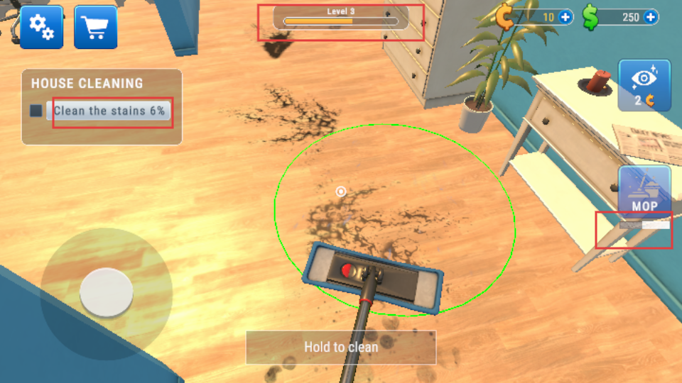 1、在Level3中,使用【MOP】按住清洁污渍,关注【Cleanthestains6%】进度条,逐步清理地面污渍。