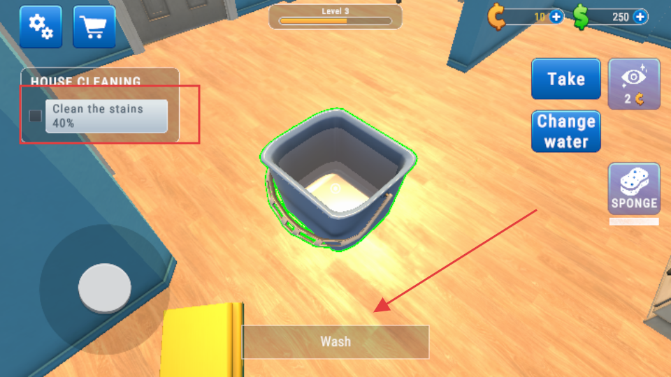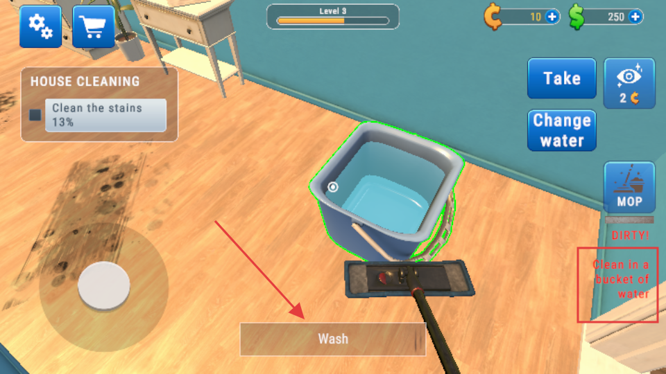 2、拖把脏后,按照提示在水桶中清洗,点击【Wash】按钮,同时留意污渍清理进度至13%。