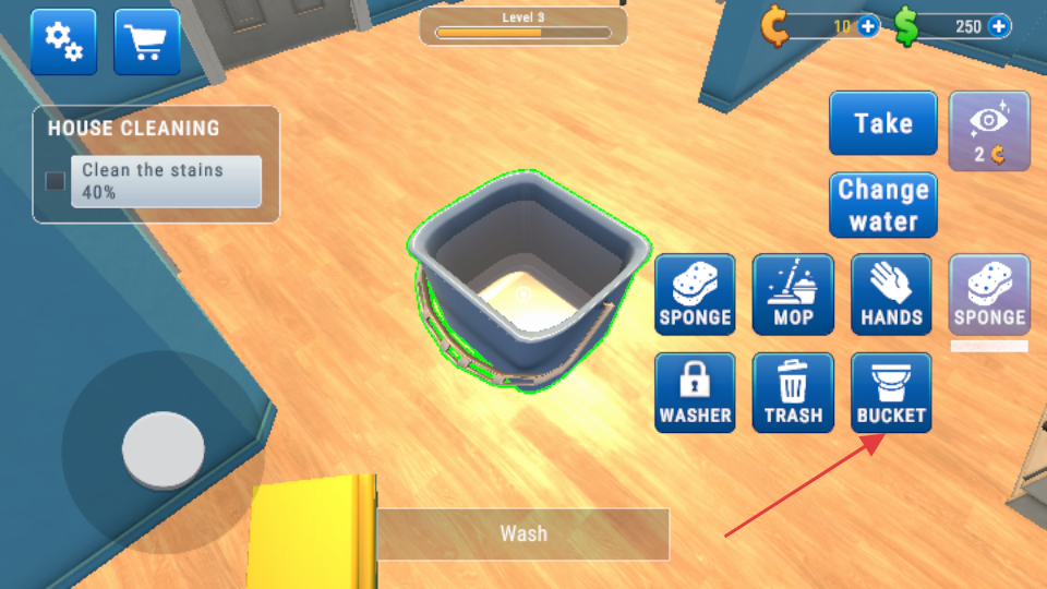 3、清洗拖把时,可选择【BUCKET】相关操作,保持清洁工具可用,推动污渍清理进度至40%。