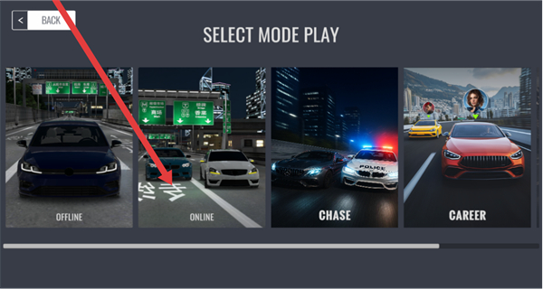 2、在“SELECT MODE PLAY”界面,选择ONLINE模式,进入联机房间列表页面。