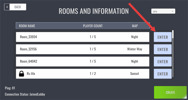 3、在ROOMS AND INFORMATION界面,可选择点击对应房间右侧的ENTER,进入该房间准备开始游玩。