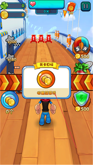1、进入关卡目标界面,控制大力水手前进,收集金币等道具,推进关卡。