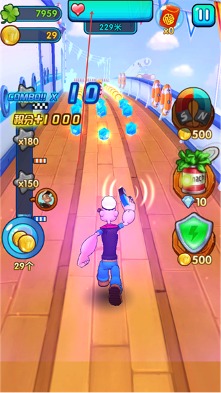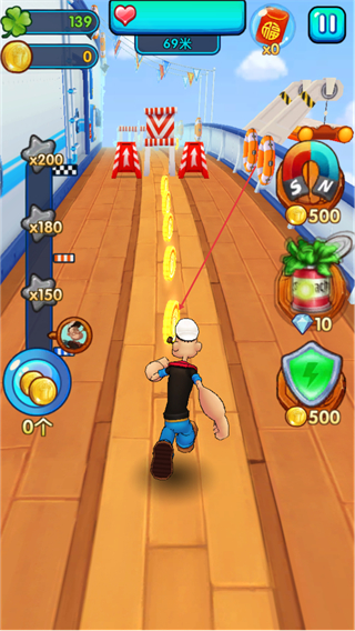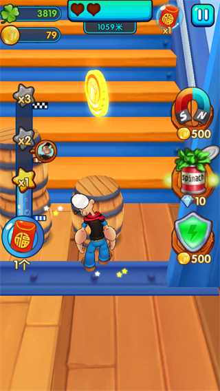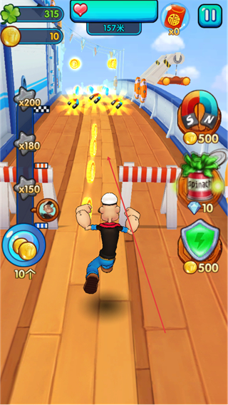 除菠菜外,还设置了磁铁、护盾、双倍金币等多种增益道具,同时加入限时挑战、障碍竞速等特色玩法,让单一的跑酷过程变得更加多元有趣。