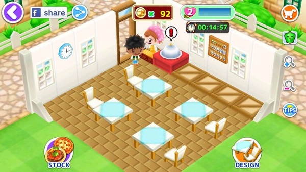 经营部分需要在制作步骤完成后才能进行,制作好的料理可以进行交易。顾客进入后需要首先点击座位为顾客安排位子,接着收取顾客的礼物,然后当菜制作完成后,点击菜品就可以为顾客上菜,顾客吃完菜品之后就可以进行收款啦。当食物被用光后就需要重新制作进行补充了。
