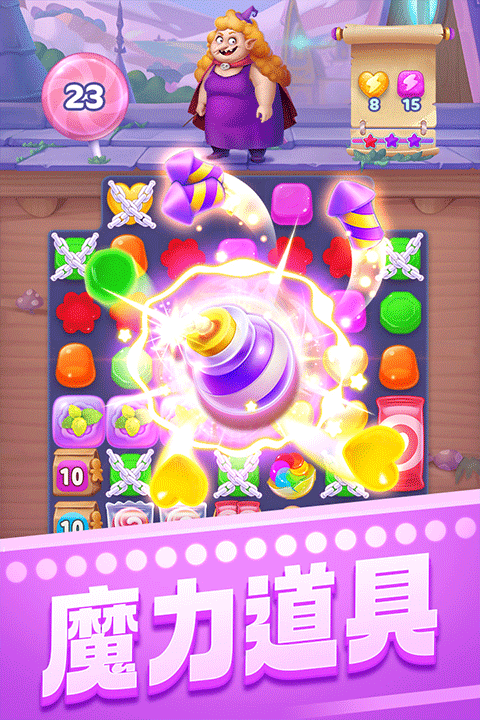 三个女巫一台戏,要么射出几个小怪兽,要么赐予几颗硬糖,要么冰冻某些糖果…总之,她们会想尽一切办法,不让你安宁,唯一的办法就是你必须尽快的消灭她们。